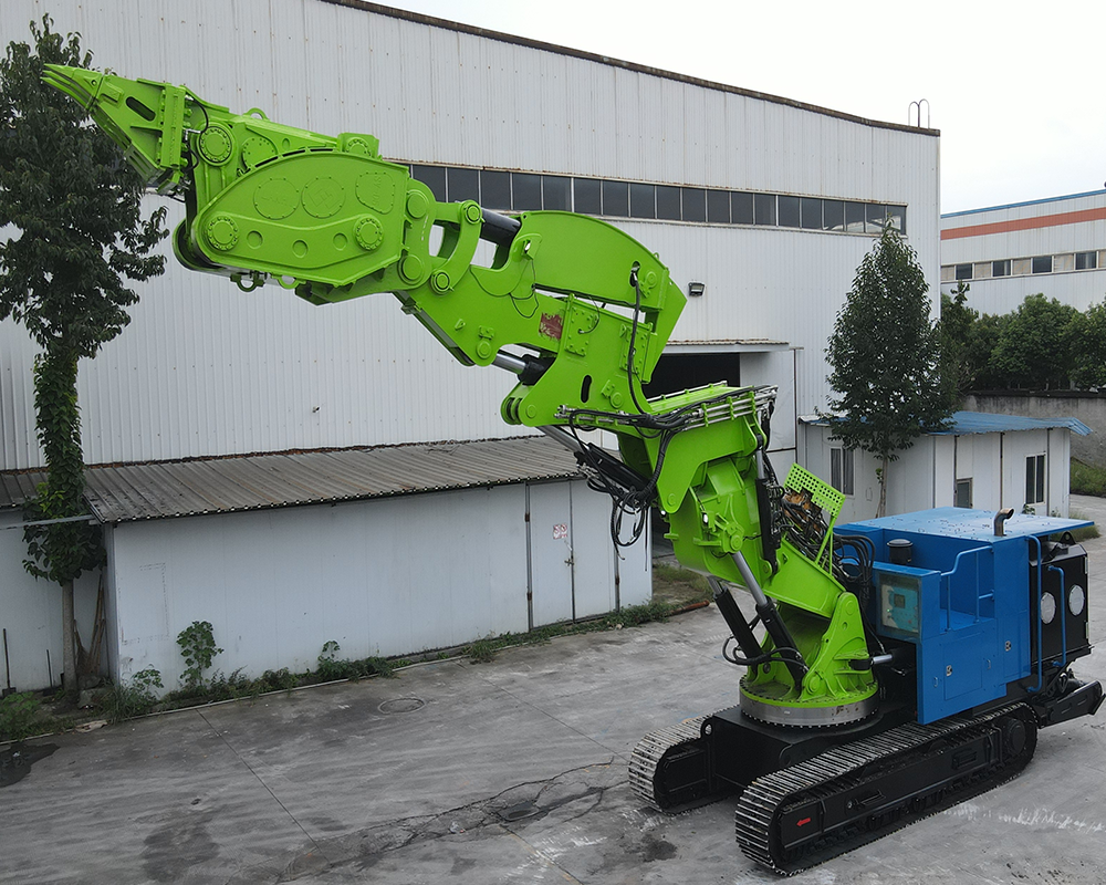 LDJ400系列多功能掘進機是一款運用于隧道非爆開挖的專用設(shè)備,主要利用工作部的高頻錘或破碎錘沖擊破巖、斗齒或釬桿楔入圍巖中的扳撬破巖和利用圍巖下方的臨空面重力作用自動破巖(高頻錘主要針對40MPa以下巖石;硬度更高、發(fā)育不好的巖石采用破碎錘施工)。采用本地控制+無線遙控控制方式,能適應(yīng)6~9.5米隧道開挖,集高頻破巖、軟土快挖、輪廓修整、噴霧除塵等功能于一體,適用于限制爆破地段(如機場、居民聚集區(qū)和野生動物保護區(qū)等)的施工,適應(yīng)性強,滿足多類圍巖施工,減少超欠挖、塌方等情況發(fā)生。