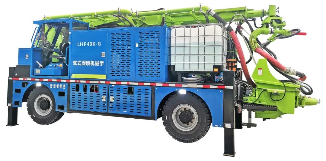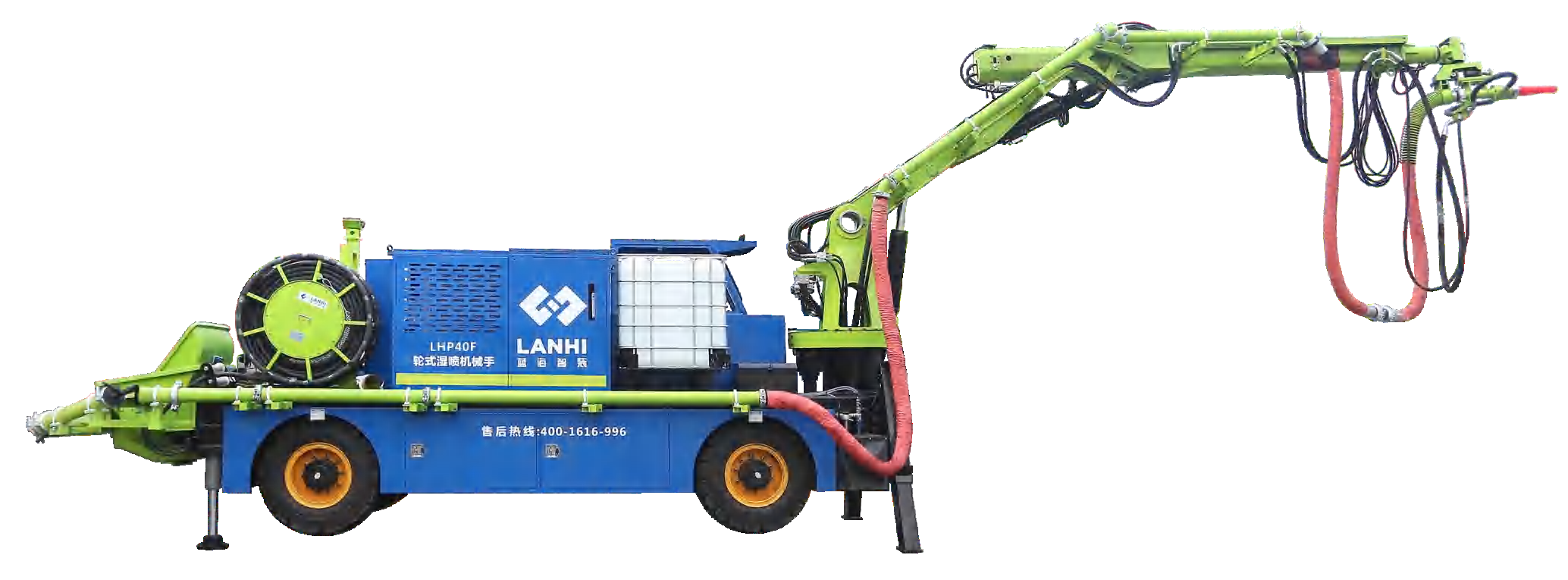 濕噴機械手在隧道施工中扮演著重要的角色。藍海智裝LCHP40D車載濕噴機械手采用汽車底盤,是一款綜合國內隧道初支混凝土噴錨工藝及施工情況研發升級的一款專用設備。該設備具有噴射方量大(最大噴射方量40m3/h)、不易堵管、回彈低、機動性好、性能穩定可靠等特點。解決了傳統小型濕噴機難以滿足大、長隧道混凝土噴射的不足,提高了施工效率,減少了混凝土消耗量。