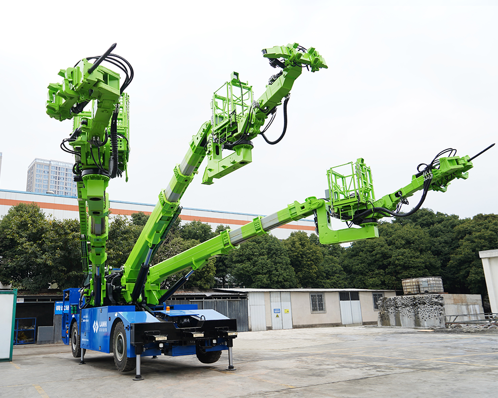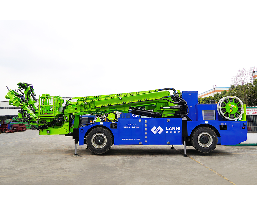 LG312M智能拱架一體化臺車具備多榀預制、雙向駕駛、四輪轉向、信息化可視化管理、帶破碎錘處理欠挖、無線遙控控制、旋轉展開式吊籃、雙動力系統、中臂舉升力3噸、車身輕量化設計、可選配雙錨桿功能、三臂三抓手三吊籃結構等優勢特點。