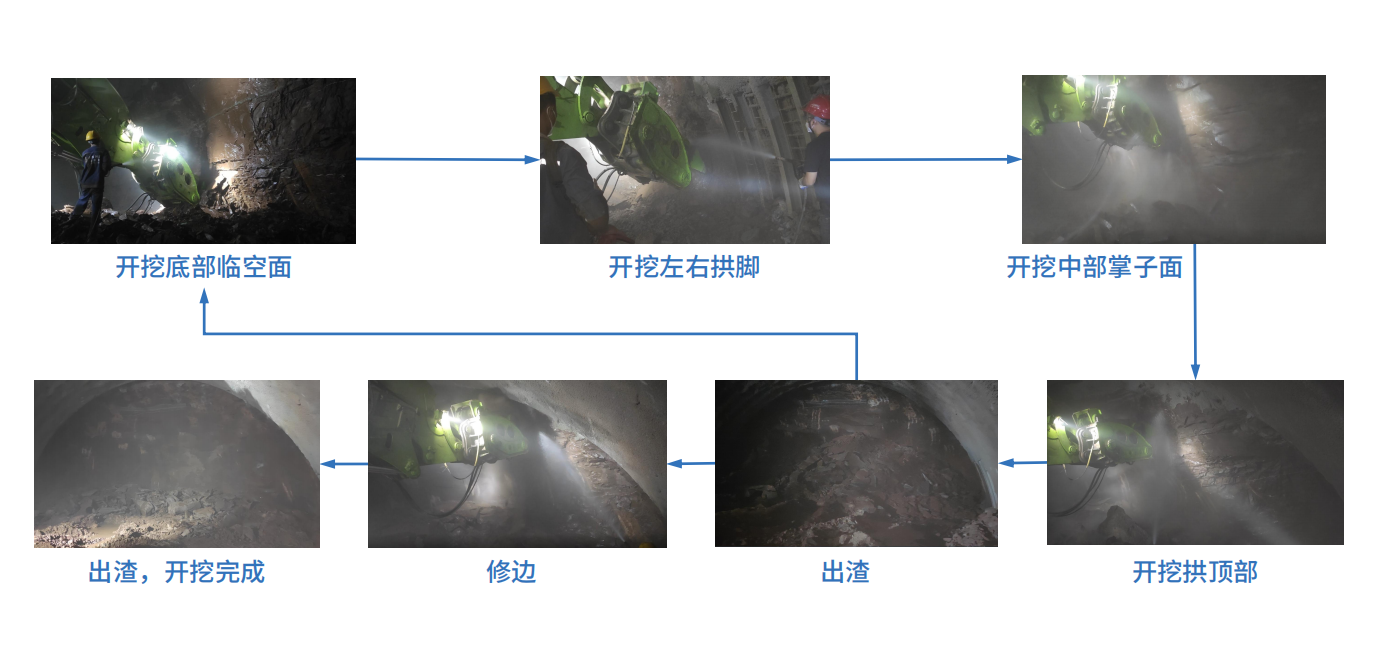 4、開(kāi)挖拱頂,平行出渣:采用平行出渣方式(開(kāi)挖作業(yè)與出渣同時(shí)進(jìn)行,大幅縮短施工時(shí)間,提高施工效率)。
